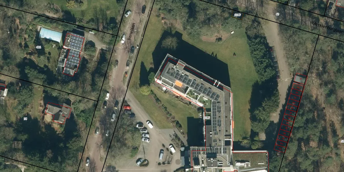 Het perceel waarop Irenelaan 9-d-4 staat heeft een oppervlakte van 1,6 ha. Dit is een zeer groot perceel. De perceeloppervlakte wordt geregistreerd door het Kadaster. Gedetailleerde informatie over de maten van dit perceel kunt u vinden in het rapport Kadastrale kaart met maatvoering van Irenelaan 9-d-4.