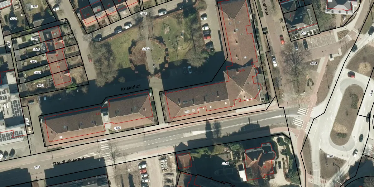 Het perceel waarop Kosterhof 25 staat heeft een oppervlakte van 1816 m². Dit is een zeer groot perceel. De perceeloppervlakte wordt geregistreerd door het Kadaster. Gedetailleerde informatie over de maten van dit perceel kunt u vinden in het rapport Kadastrale kaart met maatvoering van Kosterhof 25.