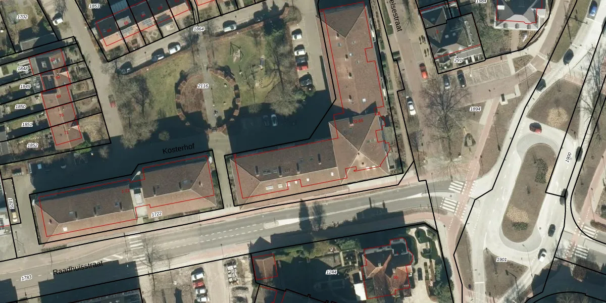 Het perceel waarop Kosterhof 26 staat heeft een oppervlakte van 1816 m². Dit is een zeer groot perceel. De perceeloppervlakte wordt geregistreerd door het Kadaster. Gedetailleerde informatie over de maten van dit perceel kunt u vinden in het rapport Kadastrale kaart met maatvoering van Kosterhof 26.