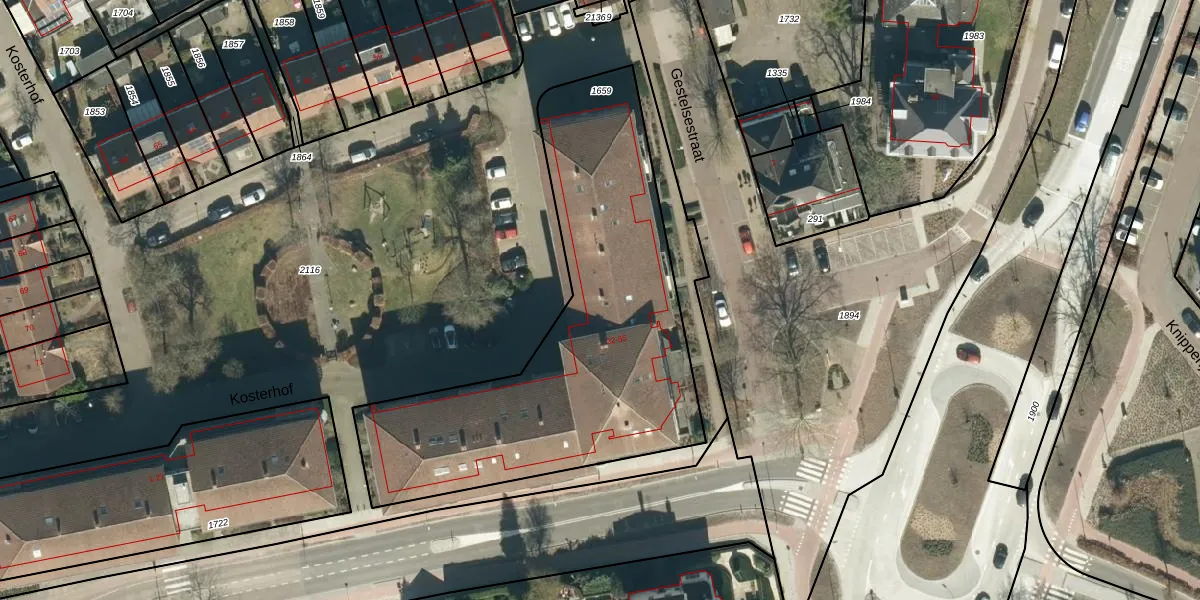 Het perceel waarop Kosterhof 30 staat heeft een oppervlakte van 1816 m². Dit is een zeer groot perceel. De perceeloppervlakte wordt geregistreerd door het Kadaster. Gedetailleerde informatie over de maten van dit perceel kunt u vinden in het rapport Kadastrale kaart met maatvoering van Kosterhof 30.