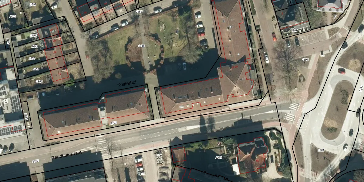 Het perceel waarop Kosterhof 35 staat heeft een oppervlakte van 1816 m². Dit is een zeer groot perceel. De perceeloppervlakte wordt geregistreerd door het Kadaster. Gedetailleerde informatie over de maten van dit perceel kunt u vinden in het rapport Kadastrale kaart met maatvoering van Kosterhof 35.