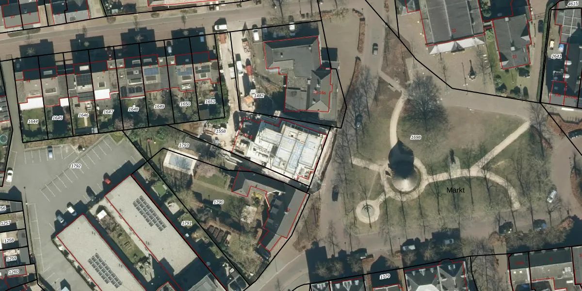 Het perceel waarop Markt 14-b staat heeft een oppervlakte van 879 m². Dit is een groot perceel. De perceeloppervlakte wordt geregistreerd door het Kadaster. Gedetailleerde informatie over de maten van dit perceel kunt u vinden in het rapport Kadastrale kaart met maatvoering van Markt 14-b.