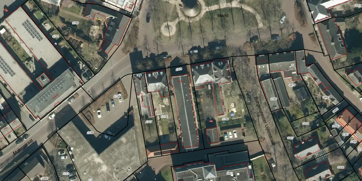 Het perceel waarop Markt 8-a staat heeft een oppervlakte van 670 m². Dit is een groot perceel. De perceeloppervlakte wordt geregistreerd door het Kadaster. Gedetailleerde informatie over de maten van dit perceel kunt u vinden in het rapport Kadastrale kaart met maatvoering van Markt 8-a.