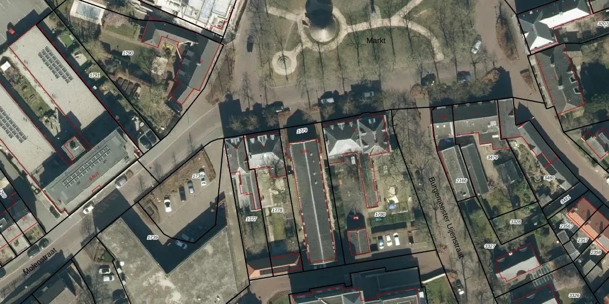 Het perceel waarop Markt 8 staat heeft een oppervlakte van 670 m². Dit is een groot perceel. De perceeloppervlakte wordt geregistreerd door het Kadaster. Gedetailleerde informatie over de maten van dit perceel kunt u vinden in het rapport Kadastrale kaart met maatvoering van Markt 8.
