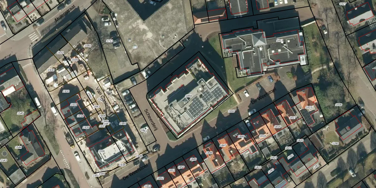 Scheerderij 1 is gelegen op kadastraal perceel WRE02C1859. Deze kadastrale aanduiding is uniek en wordt gebruikt door het Kadaster om eigendomsrechten en andere zakelijke rechten vast te leggen. Het perceel maakt onderdeel uit van de kadastrale gemeente Waalre.