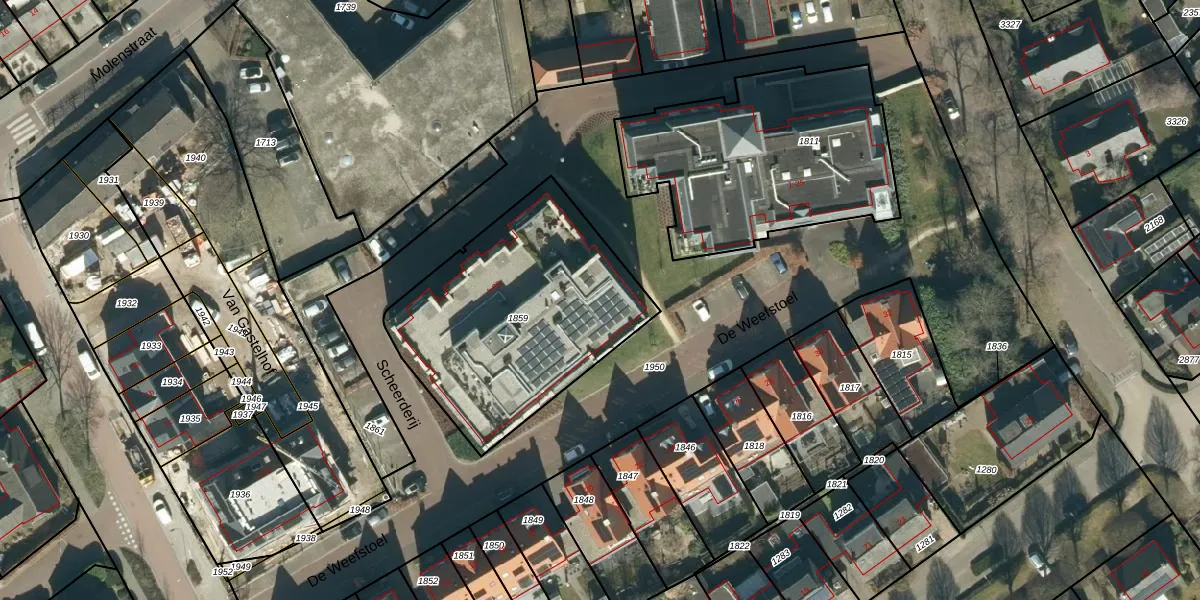 Scheerderij 14 is gelegen op kadastraal perceel WRE02C1859. Deze kadastrale aanduiding is uniek en wordt gebruikt door het Kadaster om eigendomsrechten en andere zakelijke rechten vast te leggen. Het perceel maakt onderdeel uit van de kadastrale gemeente Waalre.