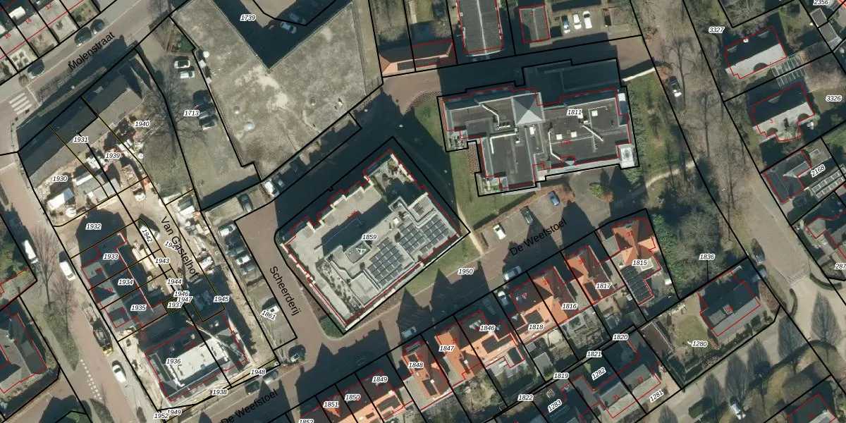 Het perceel waarop Scheerderij 25 staat heeft een oppervlakte van 1107 m². Dit is een zeer groot perceel. De perceeloppervlakte wordt geregistreerd door het Kadaster. Gedetailleerde informatie over de maten van dit perceel kunt u vinden in het rapport Kadastrale kaart met maatvoering van Scheerderij 25.