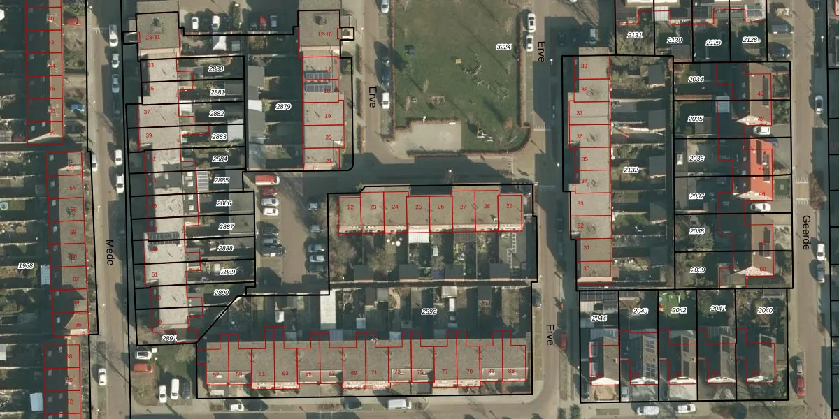 Het perceel waarop Erve 25 staat heeft een oppervlakte van 3153 m². Dit is een zeer groot perceel. De perceeloppervlakte wordt geregistreerd door het Kadaster. Gedetailleerde informatie over de maten van dit perceel kunt u vinden in het rapport Kadastrale kaart met maatvoering van Erve 25.