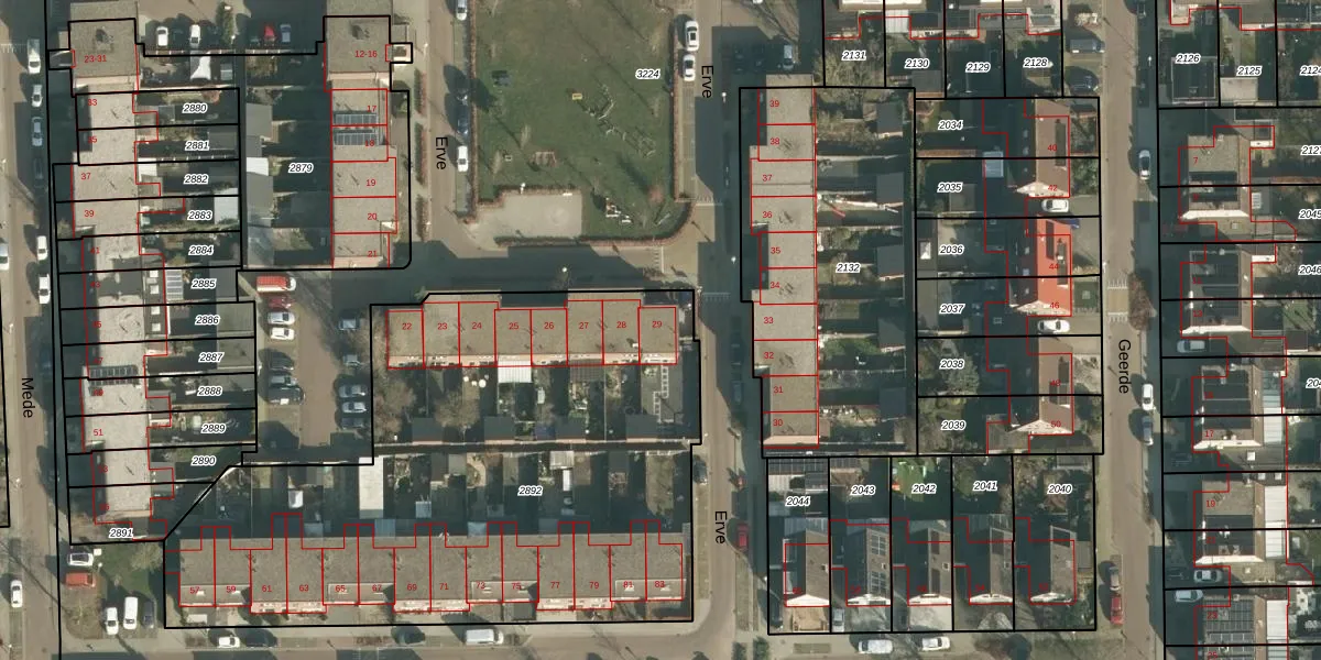 Het perceel waarop Erve 29 staat heeft een oppervlakte van 3153 m². Dit is een zeer groot perceel. De perceeloppervlakte wordt geregistreerd door het Kadaster. Gedetailleerde informatie over de maten van dit perceel kunt u vinden in het rapport Kadastrale kaart met maatvoering van Erve 29.