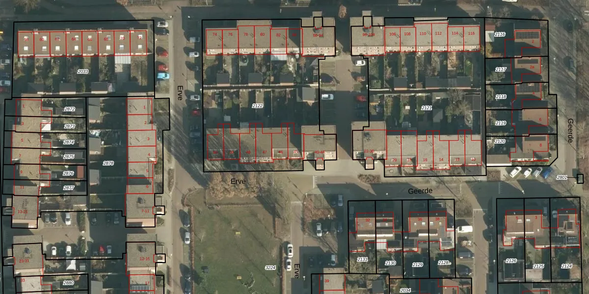 Het perceel waarop Erve 45 staat heeft een oppervlakte van 2130 m². Dit is een zeer groot perceel. De perceeloppervlakte wordt geregistreerd door het Kadaster. Gedetailleerde informatie over de maten van dit perceel kunt u vinden in het rapport Kadastrale kaart met maatvoering van Erve 45.