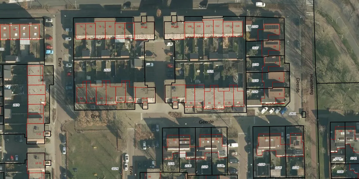 Het perceel waarop Geerde 26 staat heeft een oppervlakte van 2210 m². Dit is een zeer groot perceel. De perceeloppervlakte wordt geregistreerd door het Kadaster. Gedetailleerde informatie over de maten van dit perceel kunt u vinden in het rapport Kadastrale kaart met maatvoering van Geerde 26.