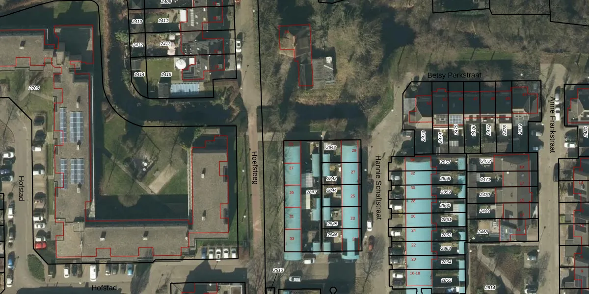 Het perceel waarop Hoefsteeg 25 staat heeft een oppervlakte van 479 m². Dit is een groot perceel. De perceeloppervlakte wordt geregistreerd door het Kadaster. Gedetailleerde informatie over de maten van dit perceel kunt u vinden in het rapport Kadastrale kaart met maatvoering van Hoefsteeg 25.