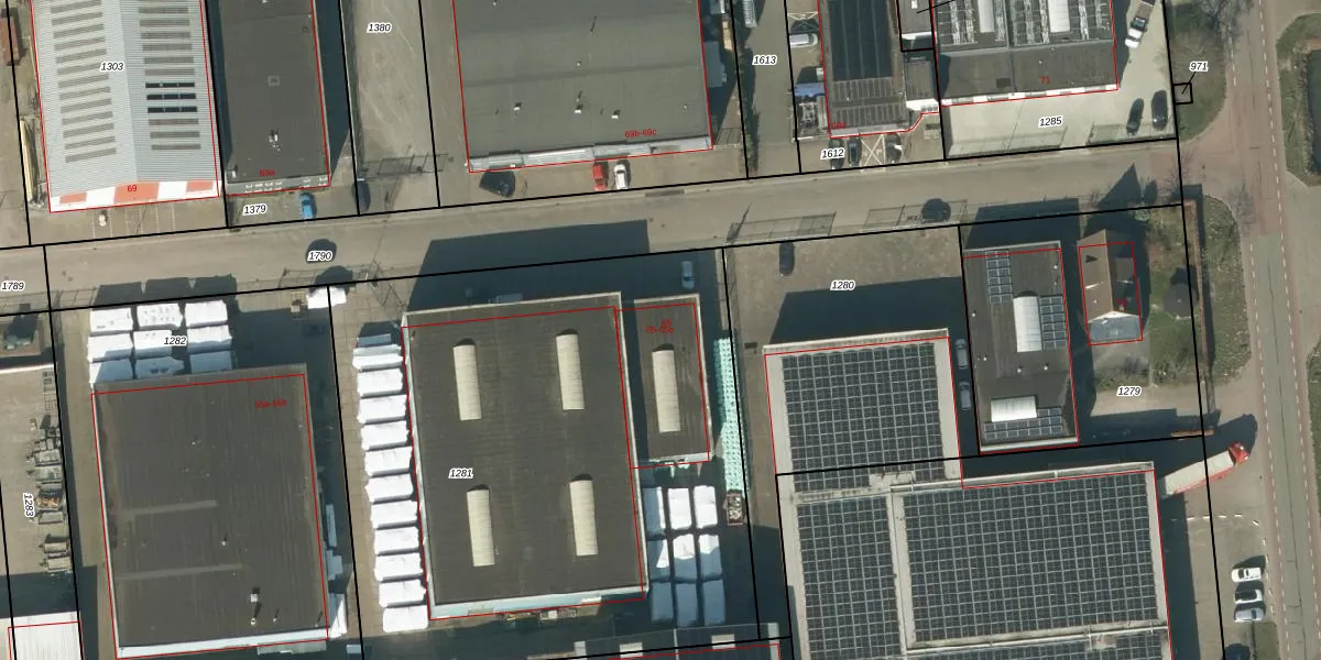 Het perceel waarop Industrieweg 65 staat heeft een oppervlakte van 3590 m². Dit is een zeer groot perceel. De perceeloppervlakte wordt geregistreerd door het Kadaster. Gedetailleerde informatie over de maten van dit perceel kunt u vinden in het rapport Kadastrale kaart met maatvoering van Industrieweg 65.
