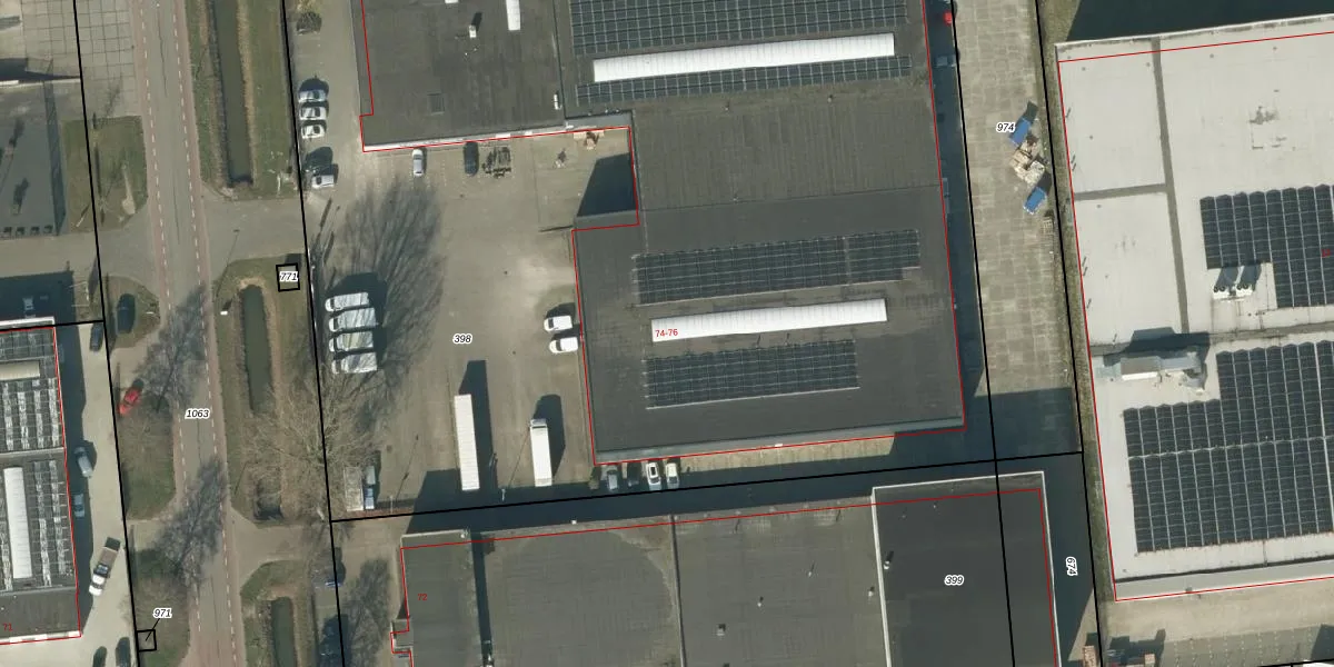 Het perceel waarop Industrieweg 74 staat heeft een oppervlakte van 1,0 ha. Dit is een zeer groot perceel. De perceeloppervlakte wordt geregistreerd door het Kadaster. Gedetailleerde informatie over de maten van dit perceel kunt u vinden in het rapport Kadastrale kaart met maatvoering van Industrieweg 74.
