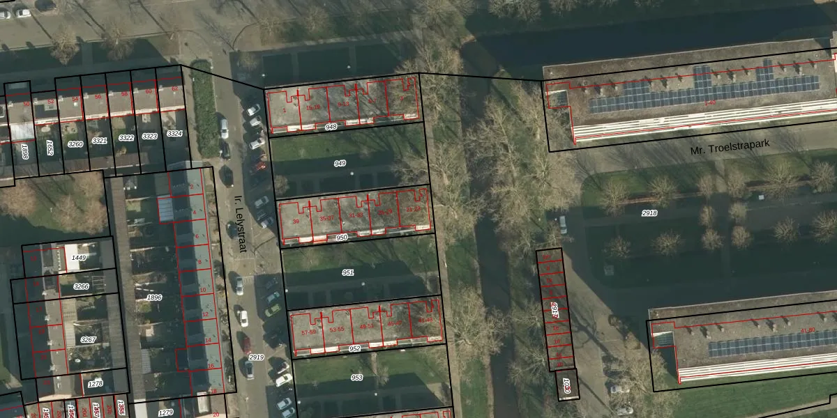 Het perceel waarop Ir. Lelystraat 21 staat heeft een oppervlakte van 438 m². Dit is een groot perceel. De perceeloppervlakte wordt geregistreerd door het Kadaster. Gedetailleerde informatie over de maten van dit perceel kunt u vinden in het rapport Kadastrale kaart met maatvoering van Ir. Lelystraat 21.