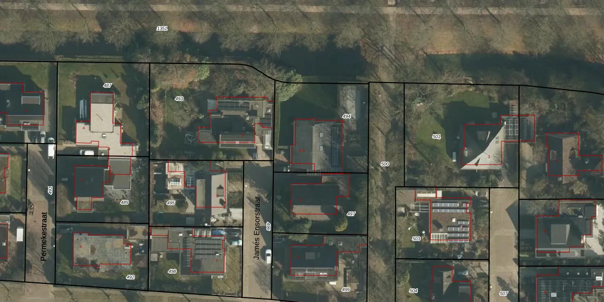 Het perceel waarop James Ensorstraat 4 staat heeft een oppervlakte van 945 m². Dit is een groot perceel. De perceeloppervlakte wordt geregistreerd door het Kadaster. Gedetailleerde informatie over de maten van dit perceel kunt u vinden in het rapport Kadastrale kaart met maatvoering van James Ensorstraat 4.