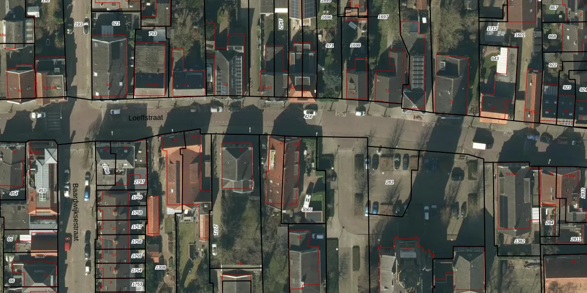 Het perceel waarop Loeffstraat 46 staat heeft een oppervlakte van 385 m². Dit is een groot perceel. De perceeloppervlakte wordt geregistreerd door het Kadaster. Gedetailleerde informatie over de maten van dit perceel kunt u vinden in het rapport Kadastrale kaart met maatvoering van Loeffstraat 46.