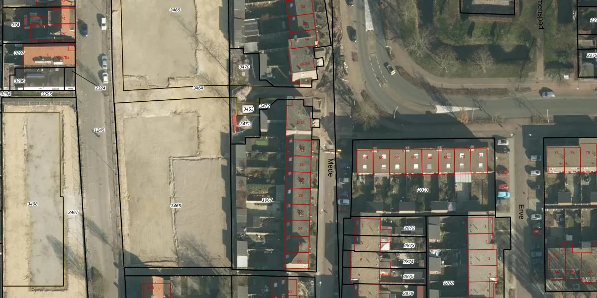 Het perceel waarop Mede 14 staat heeft een oppervlakte van 1495 m². Dit is een zeer groot perceel. De perceeloppervlakte wordt geregistreerd door het Kadaster. Gedetailleerde informatie over de maten van dit perceel kunt u vinden in het rapport Kadastrale kaart met maatvoering van Mede 14.