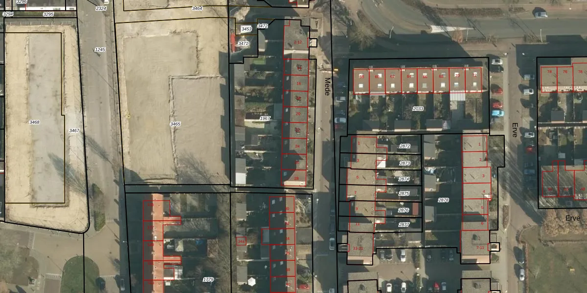 Het perceel waarop Mede 24 staat heeft een oppervlakte van 1495 m². Dit is een zeer groot perceel. De perceeloppervlakte wordt geregistreerd door het Kadaster. Gedetailleerde informatie over de maten van dit perceel kunt u vinden in het rapport Kadastrale kaart met maatvoering van Mede 24.