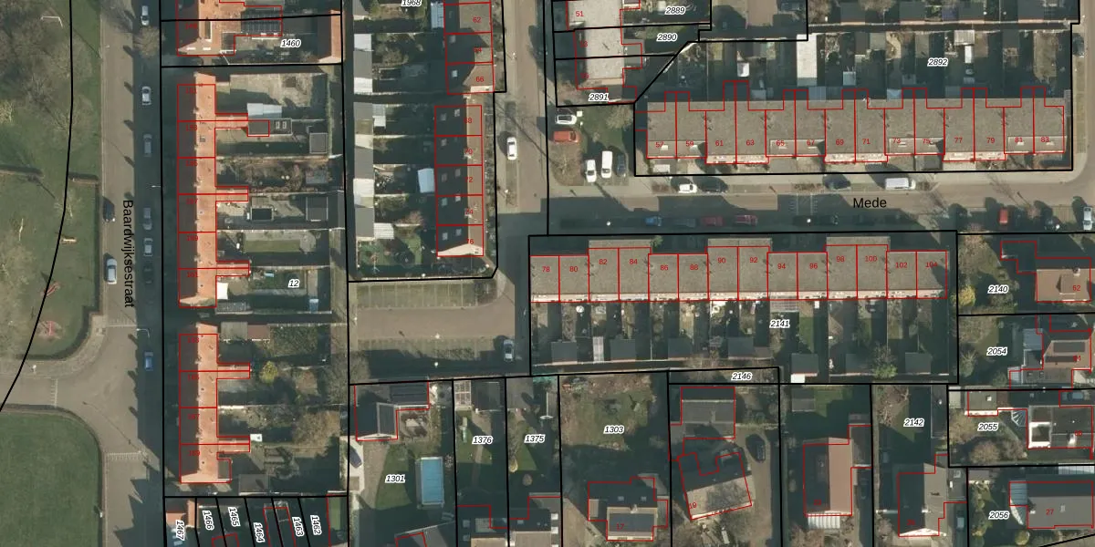 Het perceel waarop Mede 78 staat heeft een oppervlakte van 2038 m². Dit is een zeer groot perceel. De perceeloppervlakte wordt geregistreerd door het Kadaster. Gedetailleerde informatie over de maten van dit perceel kunt u vinden in het rapport Kadastrale kaart met maatvoering van Mede 78.