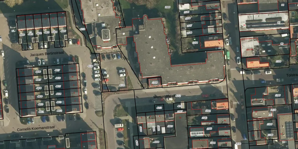 Het perceel waarop Mercatorlaan 85 staat heeft een oppervlakte van 3691 m². Dit is een zeer groot perceel. De perceeloppervlakte wordt geregistreerd door het Kadaster. Gedetailleerde informatie over de maten van dit perceel kunt u vinden in het rapport Kadastrale kaart met maatvoering van Mercatorlaan 85.