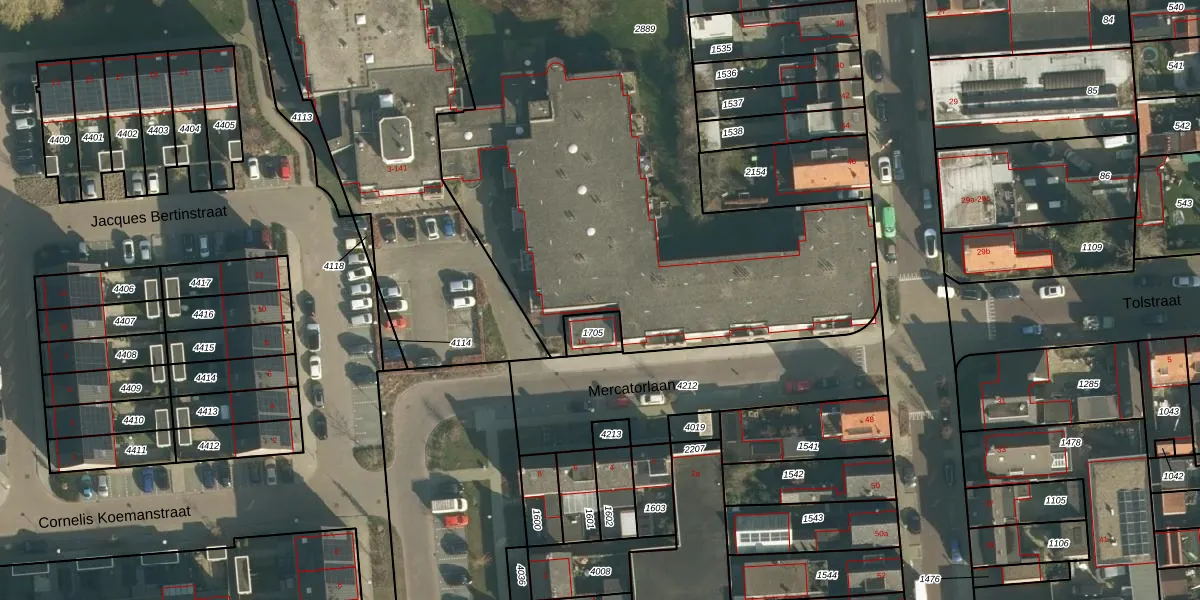 Het perceel waarop Mercatorlaan 91 staat heeft een oppervlakte van 3691 m². Dit is een zeer groot perceel. De perceeloppervlakte wordt geregistreerd door het Kadaster. Gedetailleerde informatie over de maten van dit perceel kunt u vinden in het rapport Kadastrale kaart met maatvoering van Mercatorlaan 91.