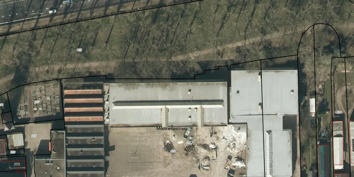 Het perceel waarop Modinettestraat 13 staat heeft een oppervlakte van 8810 m². Dit is een zeer groot perceel. De perceeloppervlakte wordt geregistreerd door het Kadaster. Gedetailleerde informatie over de maten van dit perceel kunt u vinden in het rapport Kadastrale kaart met maatvoering van Modinettestraat 13.