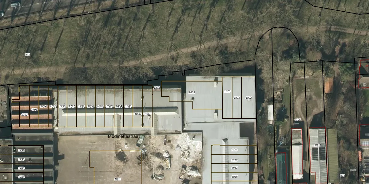 Modinettestraat 18 is gelegen op kadastraal perceel WWK00G1809. Deze kadastrale aanduiding is uniek en wordt gebruikt door het Kadaster om eigendomsrechten en andere zakelijke rechten vast te leggen. Het perceel maakt onderdeel uit van de kadastrale gemeente Waalwijk.