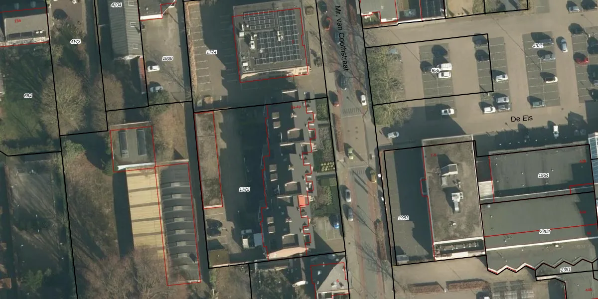 Het perceel waarop Mr. van Coothstraat 2-f staat heeft een oppervlakte van 2355 m². Dit is een zeer groot perceel. De perceeloppervlakte wordt geregistreerd door het Kadaster. Gedetailleerde informatie over de maten van dit perceel kunt u vinden in het rapport Kadastrale kaart met maatvoering van Mr. van Coothstraat 2-f.