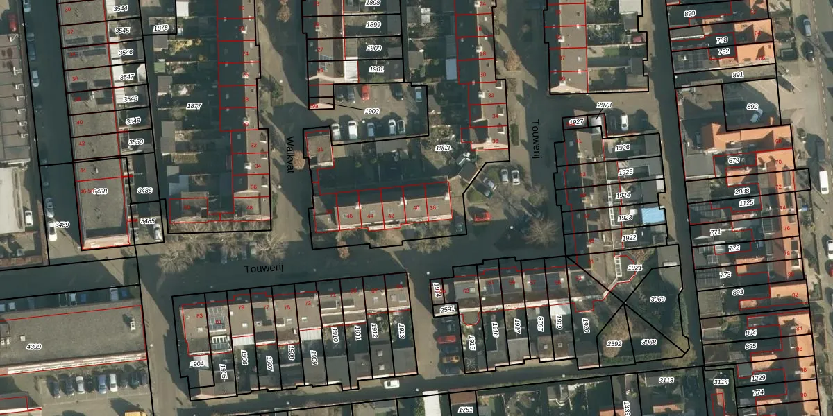 Het perceel waarop Touwerij 40 staat heeft een oppervlakte van 2327 m². Dit is een zeer groot perceel. De perceeloppervlakte wordt geregistreerd door het Kadaster. Gedetailleerde informatie over de maten van dit perceel kunt u vinden in het rapport Kadastrale kaart met maatvoering van Touwerij 40.