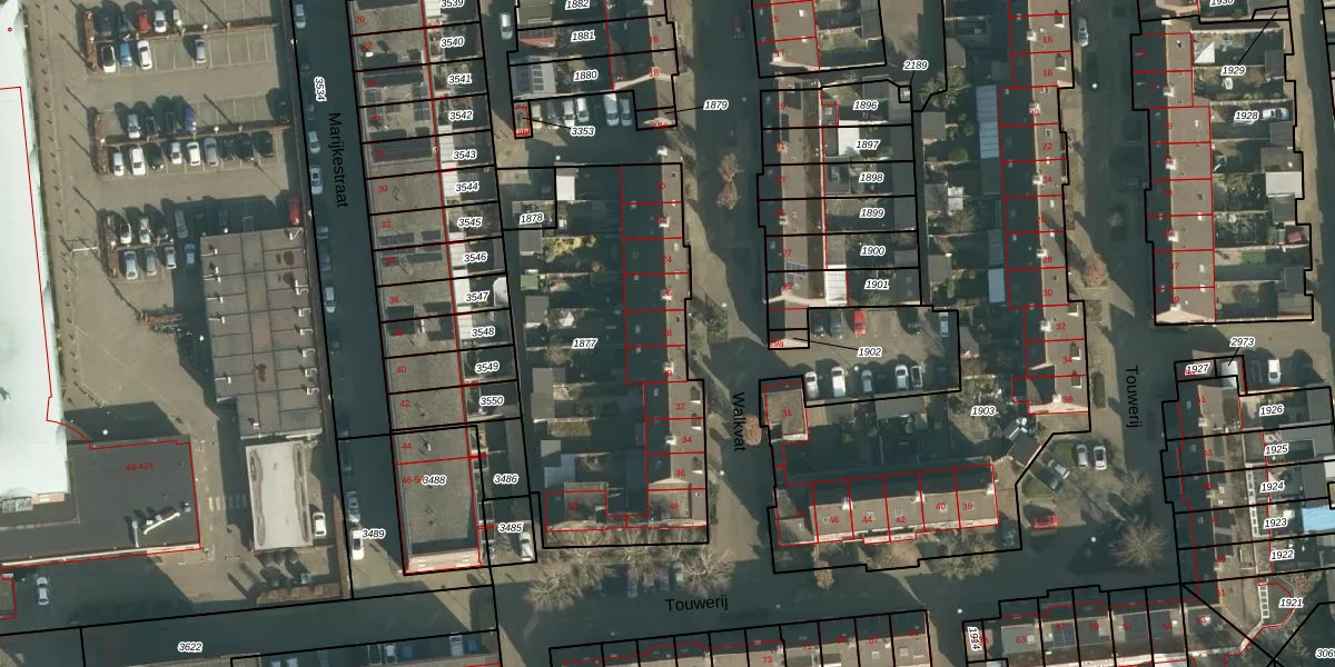 Het perceel waarop het adres ligt is WWK00-D-1877. De afkorting 'WWK00' staat voor kadastrale gemeente Waalwijk. Het perceel is kleiner dan gemiddeld in Waalwijk. Het perceel is 1440 m² groot, terwijl het gemiddelde ligt op 1669,01 m². Het kleinste perceel in de kadastrale gemeente is 0 m² groot. De grootste perceeloppervlakte is 57,3 ha. Er zijn 11 adressen aanwezig op het perceel. De laatste wijziging in het de Basisregistratie Kadaster (BRK) was op 21-02-2006.