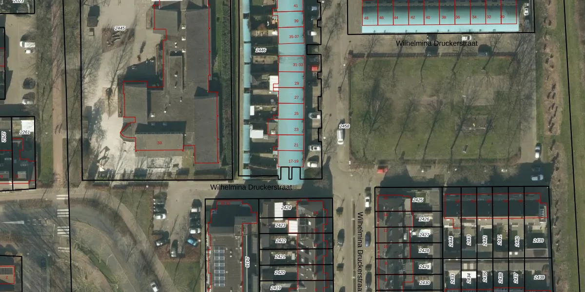 Het perceel waarop Wilhelmina Druckerstraat 21 staat heeft een oppervlakte van 2493 m². Dit is een zeer groot perceel. De perceeloppervlakte wordt geregistreerd door het Kadaster. Gedetailleerde informatie over de maten van dit perceel kunt u vinden in het rapport Kadastrale kaart met maatvoering van Wilhelmina Druckerstraat 21.