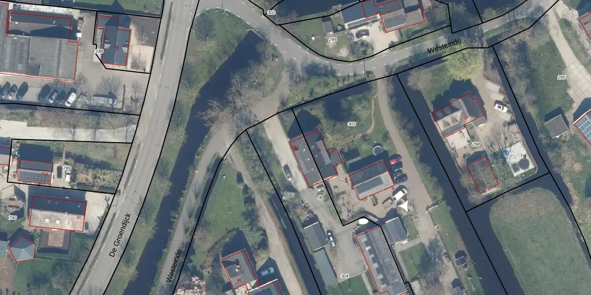 Het perceel waarop Westeinde 39-a staat heeft een oppervlakte van 2260 m². Dit is een zeer groot perceel. De perceeloppervlakte wordt geregistreerd door het Kadaster. Gedetailleerde informatie over de maten van dit perceel kunt u vinden in het rapport Kadastrale kaart met maatvoering van Westeinde 39-a.