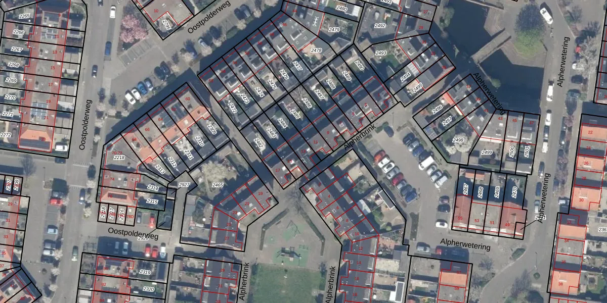 Alpherbrink 13 is gelegen op kadastraal perceel WDV01D2484. Deze kadastrale aanduiding is uniek en wordt gebruikt door het Kadaster om eigendomsrechten en andere zakelijke rechten vast te leggen. Het perceel maakt onderdeel uit van de kadastrale gemeente Waddinxveen.