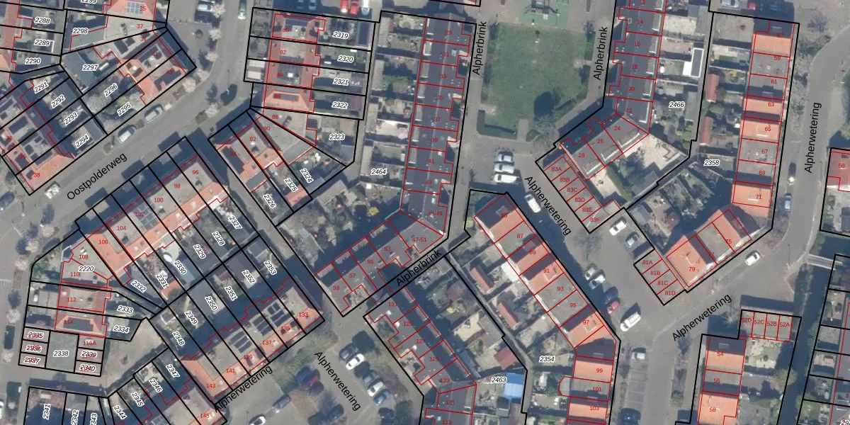 Alpherbrink 49 is gelegen op kadastraal perceel WDV01D2464. Deze kadastrale aanduiding is uniek en wordt gebruikt door het Kadaster om eigendomsrechten en andere zakelijke rechten vast te leggen. Het perceel maakt onderdeel uit van de kadastrale gemeente Waddinxveen.