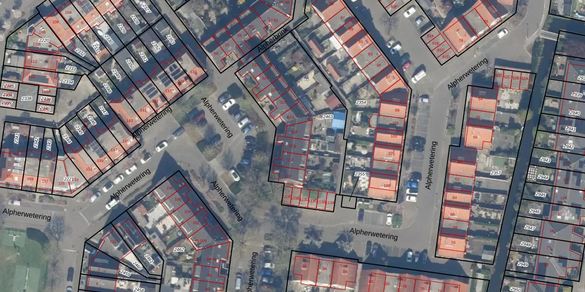 Het perceel waarop Alpherwetering 119 staat heeft een oppervlakte van 1350 m². Dit is een zeer groot perceel. De perceeloppervlakte wordt geregistreerd door het Kadaster. Gedetailleerde informatie over de maten van dit perceel kunt u vinden in het rapport Kadastrale kaart met maatvoering van Alpherwetering 119.