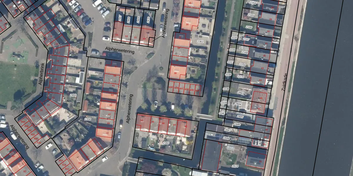 Alpherwetering 40-B is gelegen op kadastraal perceel WDV01D2361. Deze kadastrale aanduiding is uniek en wordt gebruikt door het Kadaster om eigendomsrechten en andere zakelijke rechten vast te leggen. Het perceel maakt onderdeel uit van de kadastrale gemeente Waddinxveen.