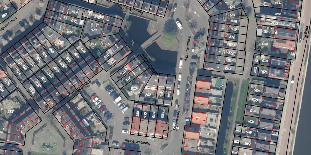 Alpherwetering 43 is gelegen op kadastraal perceel WDV01D2499. Deze kadastrale aanduiding is uniek en wordt gebruikt door het Kadaster om eigendomsrechten en andere zakelijke rechten vast te leggen. Het perceel maakt onderdeel uit van de kadastrale gemeente Waddinxveen.