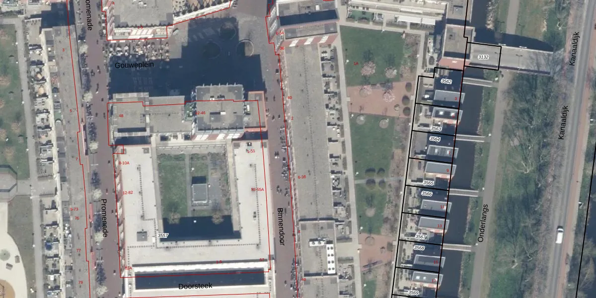 Het adres ligt op het perceel WDV01-D-3557, dat zich in de kadastrale gemeente Waddinxveen bevindt. Het perceel is met 3,1 ha relatief groot. Het gemiddelde ligt in de kadastrale gemeente Waddinxveen op 2160,88 m². Het kleinste perceel in de kadastrale gemeente is 0 m² groot. De grootste perceeloppervlakte is 49,8 ha. Er zijn 316 adressen aanwezig op het perceel. De laatste wijziging in het de Basisregistratie Kadaster (BRK) was op 11-12-2025.