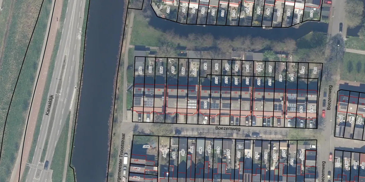Boezemweg 25 is gelegen op kadastraal perceel WDV01D2856. Deze kadastrale aanduiding is uniek en wordt gebruikt door het Kadaster om eigendomsrechten en andere zakelijke rechten vast te leggen. Het perceel maakt onderdeel uit van de kadastrale gemeente Waddinxveen.