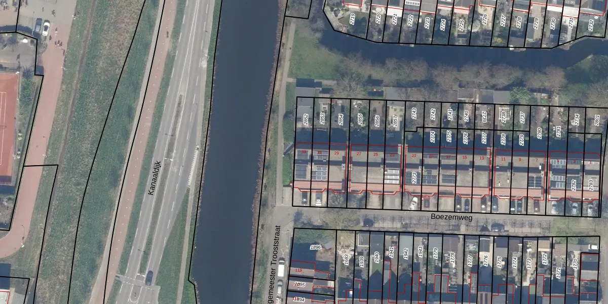 Boezemweg 33 is gelegen op kadastraal perceel WDV01D2852. Deze kadastrale aanduiding is uniek en wordt gebruikt door het Kadaster om eigendomsrechten en andere zakelijke rechten vast te leggen. Het perceel maakt onderdeel uit van de kadastrale gemeente Waddinxveen.