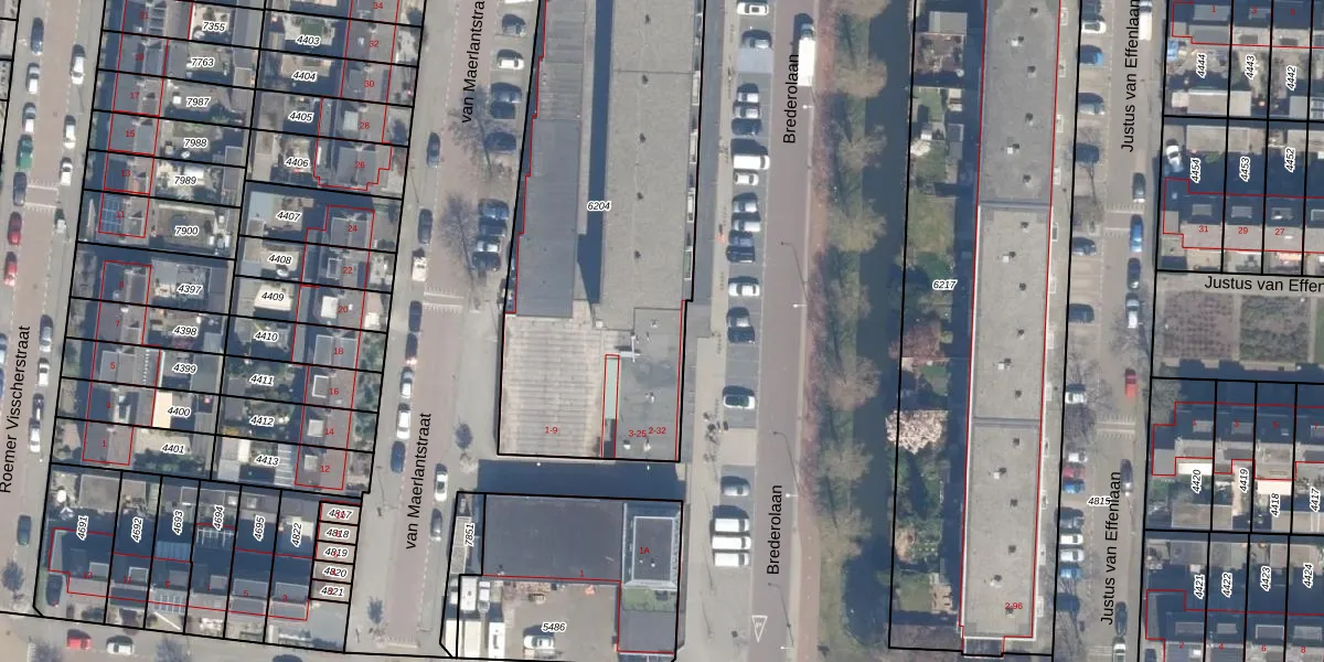 Brederolaan 4 is gelegen op kadastraal perceel WDV01B6204. Deze kadastrale aanduiding is uniek en wordt gebruikt door het Kadaster om eigendomsrechten en andere zakelijke rechten vast te leggen. Het perceel maakt onderdeel uit van de kadastrale gemeente Waddinxveen.