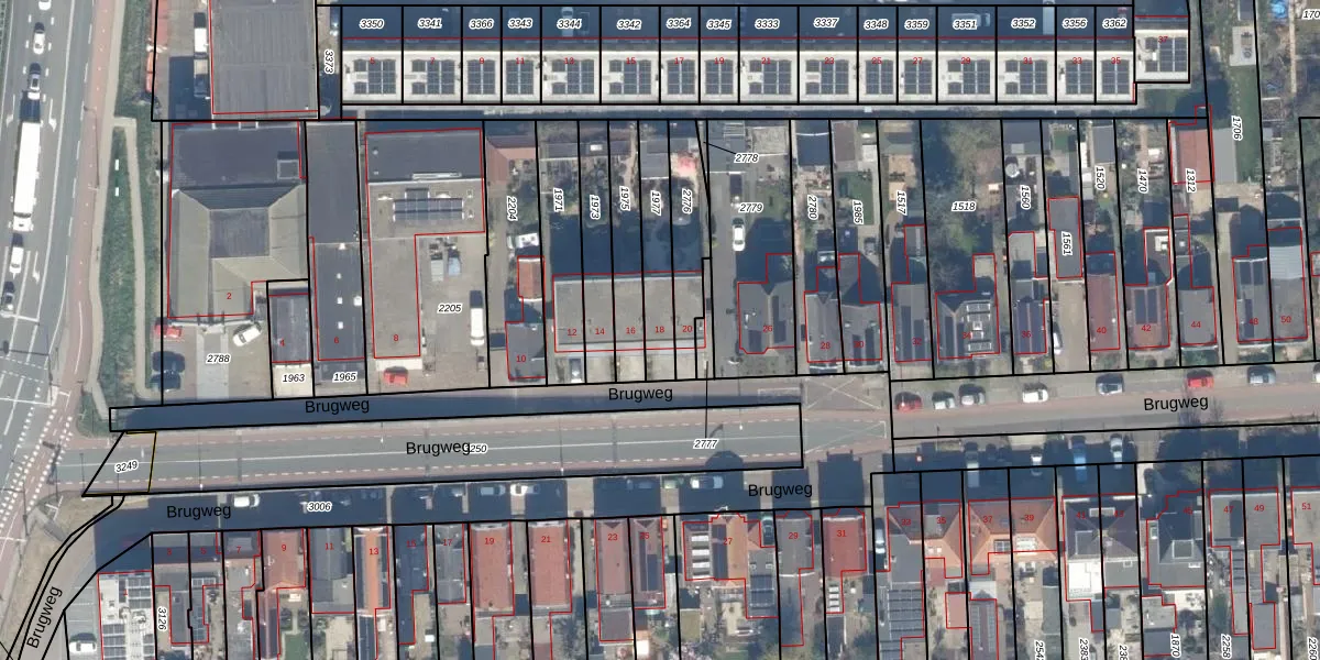 Brugweg 18 is gelegen op kadastraal perceel WDV01G1977. Deze kadastrale aanduiding is uniek en wordt gebruikt door het Kadaster om eigendomsrechten en andere zakelijke rechten vast te leggen. Het perceel maakt onderdeel uit van de kadastrale gemeente Waddinxveen.