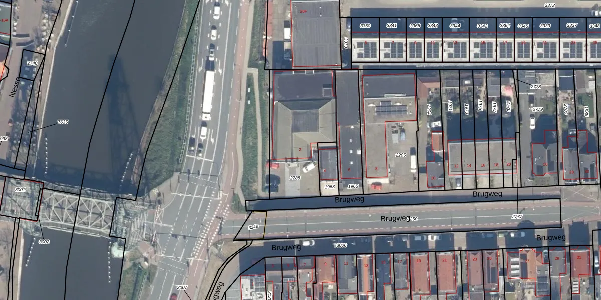 Het perceel waarop Brugweg 2 staat heeft een oppervlakte van 830 m². Dit is een groot perceel. De perceeloppervlakte wordt geregistreerd door het Kadaster. Gedetailleerde informatie over de maten van dit perceel kunt u vinden in het rapport Kadastrale kaart met maatvoering van Brugweg 2.