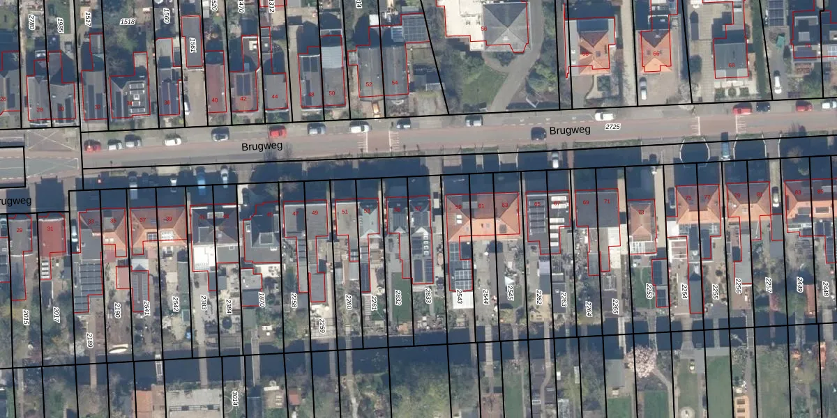Het perceel waarop Brugweg 57 staat heeft een oppervlakte van 342 m². Dit is een groot perceel. De perceeloppervlakte wordt geregistreerd door het Kadaster. Gedetailleerde informatie over de maten van dit perceel kunt u vinden in het rapport Kadastrale kaart met maatvoering van Brugweg 57.