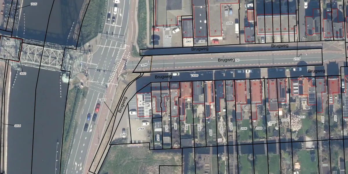 Brugweg 7 is gelegen op kadastraal perceel WDV01G1995. Deze kadastrale aanduiding is uniek en wordt gebruikt door het Kadaster om eigendomsrechten en andere zakelijke rechten vast te leggen. Het perceel maakt onderdeel uit van de kadastrale gemeente Waddinxveen.