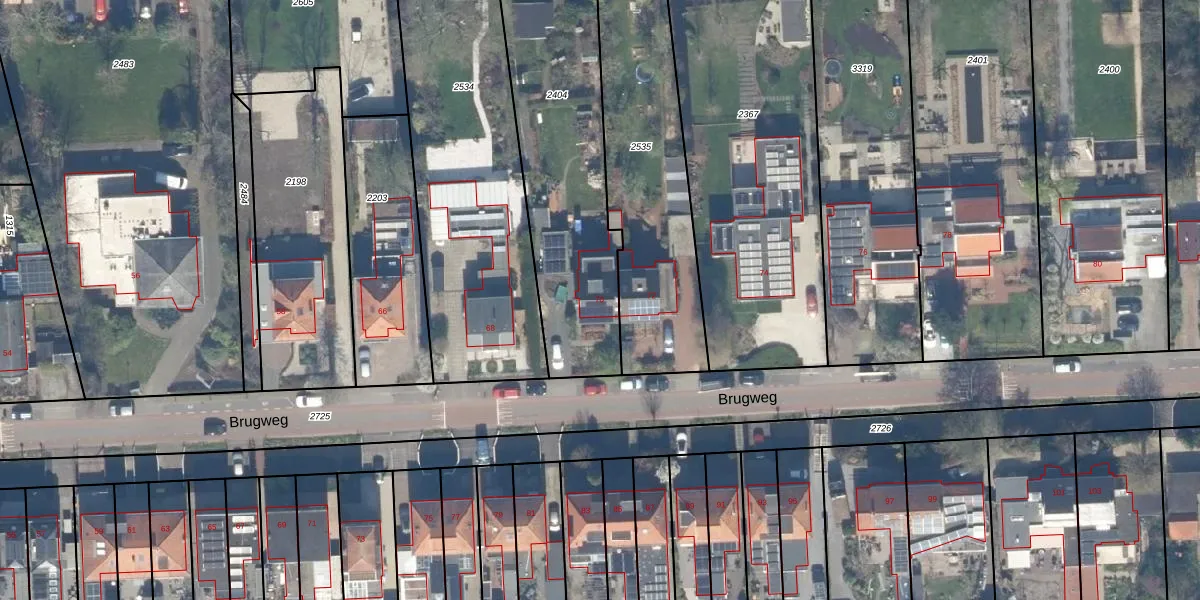 Brugweg 70 is gelegen op kadastraal perceel WDV01G2404. Deze kadastrale aanduiding is uniek en wordt gebruikt door het Kadaster om eigendomsrechten en andere zakelijke rechten vast te leggen. Het perceel maakt onderdeel uit van de kadastrale gemeente Waddinxveen.