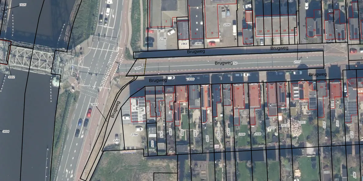 Brugweg 9 is gelegen op kadastraal perceel WDV01G1996. Deze kadastrale aanduiding is uniek en wordt gebruikt door het Kadaster om eigendomsrechten en andere zakelijke rechten vast te leggen. Het perceel maakt onderdeel uit van de kadastrale gemeente Waddinxveen.