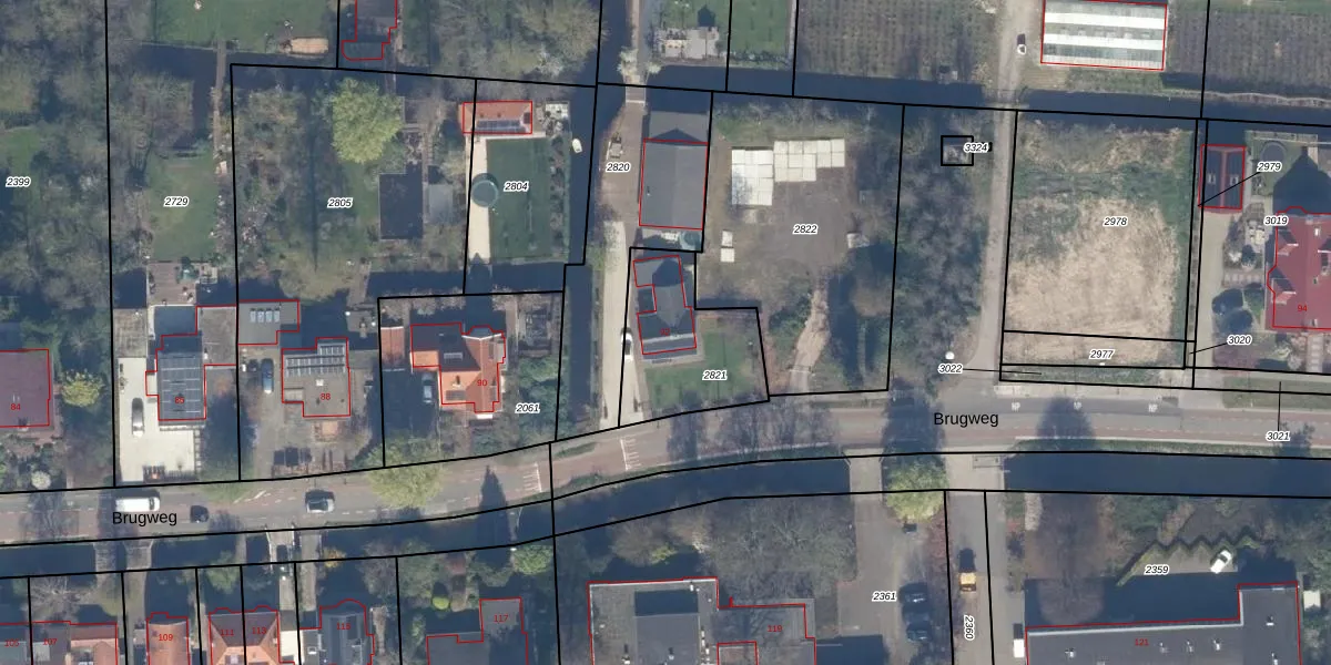 Brugweg 92 is gelegen op kadastraal perceel WDV01G2821. Deze kadastrale aanduiding is uniek en wordt gebruikt door het Kadaster om eigendomsrechten en andere zakelijke rechten vast te leggen. Het perceel maakt onderdeel uit van de kadastrale gemeente Waddinxveen.