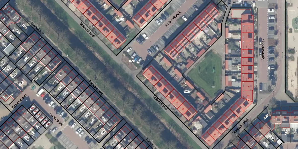 Buizerdhoek 18 is gelegen op kadastraal perceel WDV01C2612. Deze kadastrale aanduiding is uniek en wordt gebruikt door het Kadaster om eigendomsrechten en andere zakelijke rechten vast te leggen. Het perceel maakt onderdeel uit van de kadastrale gemeente Waddinxveen.